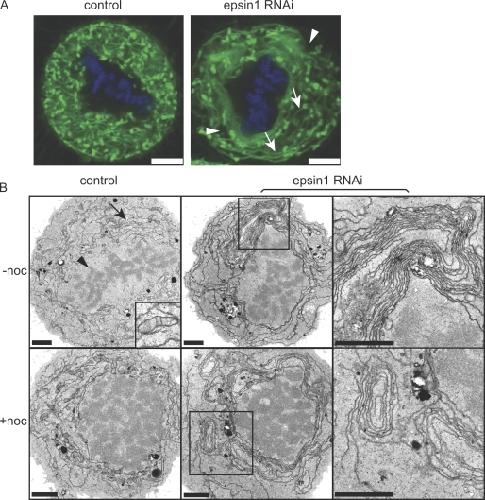 Figure 2. Effects of epsin1 reduction on membrane organization in mitotic HeLa cells. (A) Control or epsin1-depleted cells were labeled with DiOC6(3) and Hoechst 33258 to visualize membranes and chromosomes, respectively. Confocal images of mitotic cells at one z section are shown. Epsin1 depletion caused aberrant membrane morphologies such as areas without fluorescent signal (arrowheads) or long-running membrane tubules or sheets (arrows), which were not seen in normal control cells. (B) EM images of control siRNA– or epsin1 siRNA2–treated cells are shown. Control mitotic cells have even membrane structures (arrow) surrounding the condensed chromosomes (arrowhead). An area containing mitochondria is enlarged in the inset (top left). Abnormal membrane structures such as whorls with multiple layers of membranes are present in epsin1 siRNA2–treated mitotic cells. Cells were analyzed 3 d after RNAi treatment with or without nocodazole arrest (+noc). Similar results were obtained with an additional epsin1 siRNA oligonucleotide (siRNA1). Boxed areas in the middle panels are enlarged in the right panels. Bars: (A) 5 μm; (B) 2 μm.