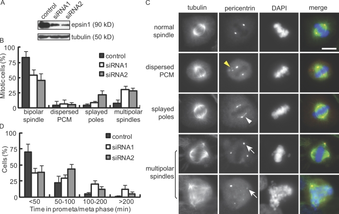 Figure 1. Effects of epsin1 reduction on mitosis in HeLa cells. (A) Western blotting of epsin1 48 h after siRNA transfection. Each oligonucleotide targeting different regions of human epsin1 caused an ∼80% reduction of epsin1 at 48 h. α-Tubulin was used as a loading control. (B) Quantification of spindle defects in HeLa cells treated with control or epsin1 siRNA oligonucleotides. Results from five independent experiments were averaged. Spindles were analyzed based on α-tubulin and pericentrin staining, with >100 prometaphase and metaphase cells counted in each condition per experiment. (C) Examples of normal and abnormal spindles visualized by α-tubulin (green), pericentrin (red), and DAPI (blue) staining. Yellow and white arrowheads indicate cytoplasmic pericentrin staining and stretched pericentrin staining along the unfocused spindle poles, respectively. White arrows point to multiple spindle poles. (D) Reduction of epsin1 affects mitotic progression. HeLa cells stably expressing histone H2B–GFP were treated with control or epsin1 siRNA. Live imaging was acquired at 3-min intervals during 32–48 h after transfection (Fig. S1 C). Quantification of the time between nuclear envelope breakdown and chromosome segregation is shown. Results from three independent experiments were averaged, with >100 mitotic cells analyzed in each condition. (B and D) Error bars show standard deviation. PCM, pericentriolar material. Bar, 10 μm.