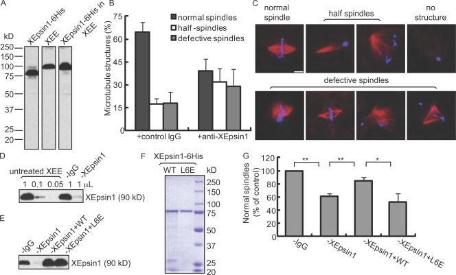 Figure 5. Epsin1 affects spindle assembly in Xenopus egg extracts. (A) Characterization of XEpsin1 antibody. Rabbit polyclonal antibodies against the ENTH domain of XEpsin1 recognized a single band in Xenopus egg extract (XEE) by Western blot analysis. 6His-tagged XEpsin1 purified from bacteria showed an apparent smaller molecular mass than the endogenous protein. After incubating with the Xenopus egg extract that was immunodepleted of endogenous XEpsin1, the recombinant XEpsin1 migrated as a similar size as the endogenous protein (XEpsin1-6His in XEE). (B) XEpsin1 antibody inhibits spindle assembly in cycled Xenopus egg extracts. Quantifications of percentages of MT structures formed in cycled extract after the addition of control antibody (+control rabbit IgG) or XEpsin1 antibody (+anti-XEpsin1) were performed by analyzing structures associated with >300 sperm in each reaction. Results from four independent experiments were averaged. (C) Examples of Xenopus sperm associated with normal spindle, abnormal MT structures, or no MT structures. MT structures were visualized by rhodamine-tubulin, and chromosomes were stained with DAPI. (D) Western blot analysis of XEpsin1 in extracts after immunodepletion. Different amounts of untreated egg extracts were loaded as standards. Mock-depleted extract (−IgG) had a similar level of XEpsin1 as nondepleted extract, whereas ∼90% of XEpsin1 was depleted by XEpsin1 antibody (−XEpsin1). (E) Western blot analysis of XEpsin1 after depletion (−XEpsin1) and add back of recombinant wild-type or mutant XEpsin1 (−XEpsin1 + WT or −XEpsin1 + L6E) compared with mock-depleted extract. (F) Coomassie blue staining of SDS-PAGE to show the quality of purified wild-type (WT) and mutant (L6E) XEpsin1 proteins. (G) Effects of depletion/add back of XEpsin1 on spindle assembly in CSF extracts. Mock-depleted extract, XEpsin1-depleted extract (−XEpsin1), or XEpsin1-depleted extract with the addition of wild type or the L6E mutant of the XEpsin1-6His protein was allowed to form spindles by incubation with sperm DNA. The number of normal spindles was quantified and normalized against mock-depleted extract. Results from three independent experiments, each containing structures associated with >300 sperms per reaction, were averaged. *, P < 0.05; **, P < 0.01. (B and G) Error bars show standard deviation. Bar, 10 μm.