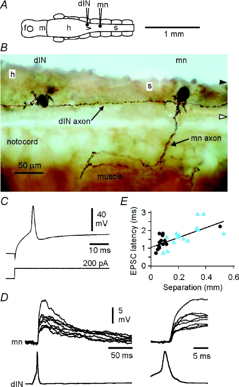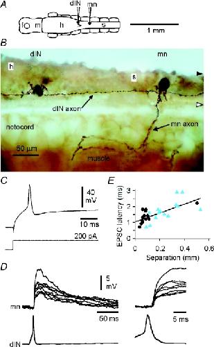 Figure 2. Excitatory connections from dINsA, diagram of the CNS in dorsal view to show a recorded dIN and motoneuron (mn) (shown in B–D). B, photomicrograph of neurobiotin-filled neurons in lateral view where a rostral dIN with short dendrites has a descending axon that passes a more caudal motoneuron (mn) with mainly ventral dendrites and identified by its peripheral axon. C, the dIN in B shows a characteristic single, broad action potential in response to injected depolarising current. D, paired recording from the neurons in B (at two time scales; Mg2+ omitted from saline) shows that current-evoked spikes in the dIN produce long EPSPs in the motoneuron (left) at consistent, short latencies (right). E, latencies of EPSPs increase with separation between presynaptic dINs and their postsynaptic targets (dIN–dIN synapses, circles; dIN–non-dIN synapses, triangles). The regression equation is d = 1.04 + 2.79s where d is delay in ms and s is separation in mm. |