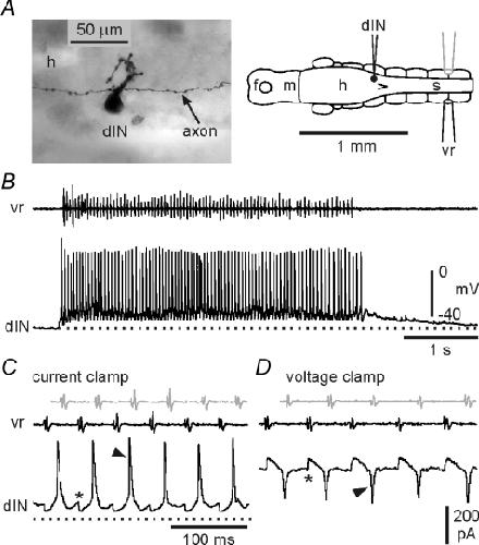 Figure 3. Activity of a reticulospinal dIN during swimmingA, anatomy of a recorded dIN with ascending and descending axons and mainly dorsal dendrites. The diagram shows the soma position and recording arrangement. The ventral root electrode (vr) was placed on the opposite side to the intracellular recording (black). B, single episode of swimming, monitored with the ventral root electrode (vr), showing the reliability of firing of a dIN. C, expanded swimming cycles from B to show the normal swimming pattern (*: IPSPs; arrowhead: spike). The grey vr trace shows the motor activity from the recorded, vr trace (black) adjusted to show the assumed timing of ipsilateral motor activity (as though recorded ipsilaterally by the grey electrode in diagram A). D, equivalent cycles of swimming recorded from the same dIN under voltage clamp reveal the underlying, rhythmic synaptic drive (*: IPSCs; arrowhead: fast EPSC). The grey vr trace is the assumed ipsilateral motor activity as in C. |