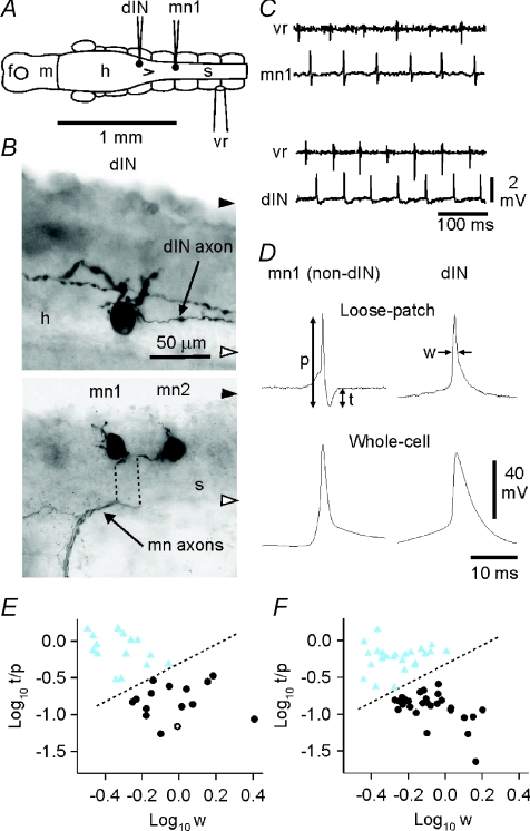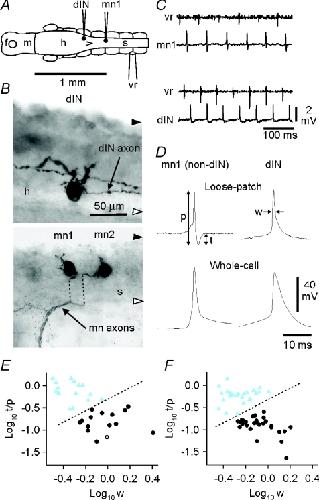 Figure 5. Distinguishing neurons by spike shape in loose patch recordingsA, locations of illustrated neurons (from separate recordings; contralateral ventral root electrode). B, anatomical characterisation of a dIN (upper micrograph) with 2 large dorsal dendrites and a single descending axon (an additional axon is from a separate neuron) and one of a pair of motoneurons (lower micrograph; mn1; dotted lines indicate displacement of axons during processing). Black and white arrowheads indicate the dorsal and ventral limit of the CNS respectively (h: hindbrain, s: spinal cord). C, loose patch recordings of activity from a non-dIN neuron (mn1) and a dIN during swimming, monitored from a ventral root on the opposite side. D, distinguishing dINs from non-dINs by extracellular spike shape (upper records, normalised to the amplitude of the initial peak; p: peak-to-peak amplitude, t: trough amplitude, w: width at half initial peak amplitude). Lower records are corresponding spikes during swimming after attaining the whole-cell configuration (all averages of ∼20 spikes). E, cluster analysis distinguishes two groups of neurons that match a separation based on anatomical features (circles, dIN; triangles, non-dIN; open symbols are the illustrated neurons). F, cluster analysis on a larger group of neurons (n= 52) selected at random from those used to measure spike timing during swimming (see Fig. 6) again separates the neurons into two groups, equivalent to the dINs and non-dINs in E. |