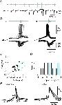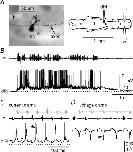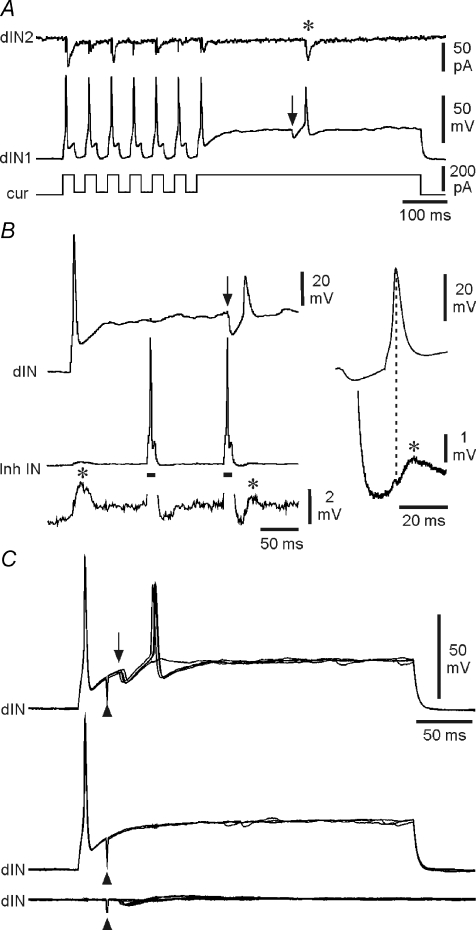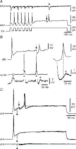 Figure 8. Post-inhibitory rebound in dINsA, rebound spikes to current pulses (dIN1), then a rebound spike following a spontaneous IPSP (at arrow), producing an EPSC (*) in a postsynaptic neuron (dIN2). B, when held just above spike threshold, a dIN fires on rebound following an IPSP (at arrow) elicited by the second of two spikes evoked in an inhibitory interneuron (Inh IN) by depolarising current (bars). Evoked and rebound spikes in the dIN both evoke EPSPs (*) in the inhibitory interneuron. Right, averages of 5 rebound spikes in the dIN and resulting EPSPs in the inhibitory interneuron. C, rebound in a dIN, depolarised just above spike threshold, following IPSPs (arrow) evoked by stimulation (at arrowhead) of the contralateral side of the spinal cord (upper overlapped traces). No rebound occurs where IPSPs fail (middle traces) or when the dIN is at rest (lower traces). |