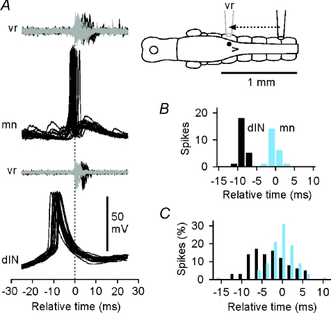 Figure 4. Spikes in dINs are early relative to those in non-dINs and vrs during swimmingA, overlapped spikes of a motoneuron (mn) and dIN aligned relative to the start of ‘adjacent’ ventral root (vr) bursts (dashed line) show that the dIN fires earlier. The inset diagram shows the typical recording arrangement (actual recording site and vr bursts, black; adjusted recording site and vr bursts, grey; see Fig. 1). B, distribution of spike peak timing for the two neurons in A. C, the relative timing of spike peaks for 16 dINs (dark bars) and 15 non-dINs (light bars), all adjusted to give timings relative to an adjacent ventral root. Distributions of spike timings for each neuron (e.g. B) were normalised (as % of the whole sample of spike times for each neuron, using 2 ms bins) and then combined to give overall spike time distributions for dINs and non-dINs. |