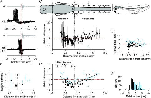 Figure 6. Timing of neuron spikes during swimmingA, timing of spikes in a dIN (upper) and non-dIN (lower) recorded in the same animals with loose patch, aligned relative to the start of vr bursts adjusted to the 5th post-otic cleft. The vertical dashed line indicates vr burst onset. B, the timing of spikes (±s.d.) in dIN (circles) and non-dIN (triangles) neurons recorded at different longitudinal positions in a single animal. C, the timing of spikes (±s.d.) at different longitudinal positions for the whole data set (103 neurons). The dorsal view of the CNS and swimming muscles (labelled in Fig. 1B) is shown at the same scale and horizontal alignment as the graph; the small lateral view of the tadpole shows the region illustrated (*: obex; grey arrow: 5th post-otic cleft used as a timing reference; horizontal dashed line: 0 ms). D, the timing of spikes as in C showing neuron identification (dIN, circles; non-dIN, triangles) and contiguous regression lines (0â0.725 mm: y= 9.575 â 20.605x, where y is in ms and x is in mm, R2= 0.51; from 0.725 mm: y=â13.013 + 10.659x; R2= 0.63). Approximate rhombomere boundaries and obex (*) are indicated. E, deviation of timing measurements from the regression lines in D (slope: 0.05 ms mmâ1, R2= 0.00). F, mean firing times of dINs (dark bars) and non-dINs (light bars), transformed to remove the effect of longitudinal position as in part E. |