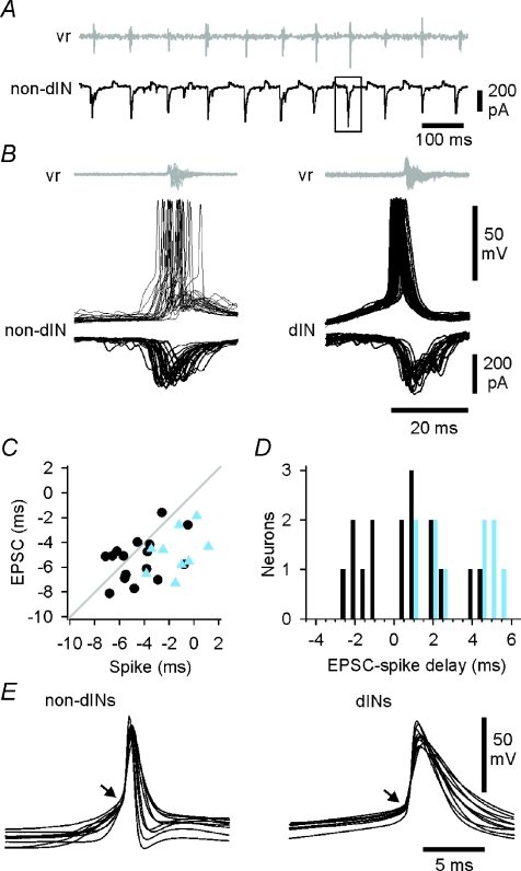 Figure 7. The relative timing of spikes and EPSCs during swimmingA, recording from a non-dIN neuron under voltage clamp during swimming showing EPSCs for timing measurement (e.g. box). Swimming was monitored from a ventral root on the opposite side (vr: shown adjusted as though recorded from the same side). B, superimposed, spikes and vr bursts from consecutive swimming cycles in a non-dIN and a dIN. Below each are overlapped EPSCs from separate swimming sequences in the same neurons, also aligned to the starts of vr bursts (adjusted as in A). C, the timing of spikes and EPSCs (median values from individual neurons) measured relative to vr burst onset (dIN, circles; non-dIN, triangles; line indicates equality). D, the delay between EPSCs and spikes in the same neuron, plotted for individual dINs (dark bars) and non-dINs (light bars). E, overlapped averages of spikes recorded from different neurons during swimming to show pre-potentials (= EPSPs) in non-dINs and immediate take-offs in dINs (arrows). |