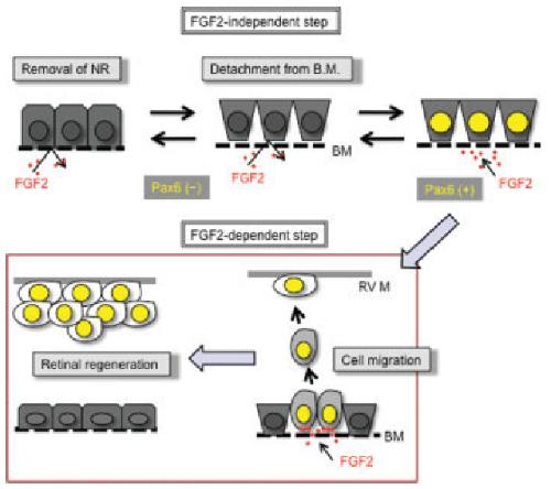 The retina regenerates from retinal pigment epithelial (RPE) cells by transdifferentiation in the adult newt and Xenopus laevis when it is surgically removed. This was studied under a novel culture condition, and we succeeded, for the first time, in developing a complete retinal laminar structure from a single epithelial sheet of RPE. We cultured a Xenopus RPE monolayer sheet isolated from the choroid on a filter cup with gels overlaid and found that the retinal tissue structure differentiated with all retinal layers present. In the culture, RPE cells isolated themselves from the culture substratum (filter membrane), migrated, and reattached to the overlaid gel, on which they initiated transdifferentiation. This was exactly the same as observed during in vivo retina regeneration of X. laevis. In contrast, when RPE monolayers were cultured similarly without isolation from the choroid, RPE cells proliferated, but remained pigmented instead of transdifferentiating, indicating that alteration in tissue interaction triggers transdifferentiation. We then examined under the conventional tissue culture condition whether altered RPE-choroid interaction induces Pax6 expression. Pax6 was upregulated in RPE cells soon after they were removed from the choroid, and this expression was not dependent of FGF2. FGF2 administration was needed for RPE cells to maintain Pax6 expression. From the present results, in addition to our previous ones, we propose a two-step mechanism of transdifferentiation: the first step is a reversible process and is initiated by the alteration of the cell-extracellular matrix and/or cell-cell interaction followed by Pax6 upregulation. FGF2 plays a key role in driving RPE cells into the second step, during which they differentiate into retinal stem cells.