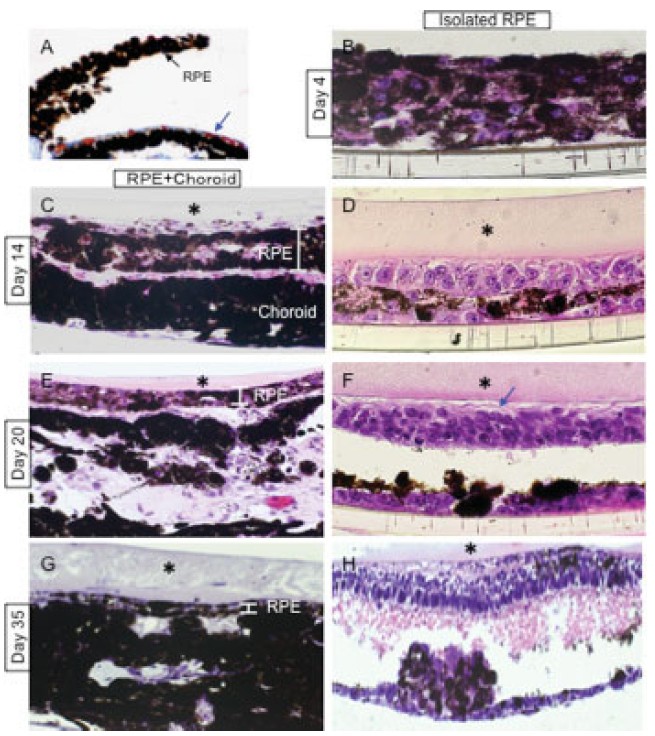 RPE sheets (B, D, F, H) and RPE with choroid (C, E, G)