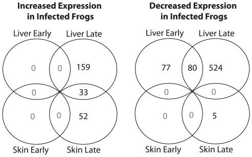 Figure 1. Summary of significant changes in gene expression between Bd-exposed and naïve control frogs.Numbers of genes with increased and decreased expression in infected frogs are shown for the skin (the site of infection) and the liver (an immunologically and physiologically important organ). Data are summarized for two time-points: early (3 days after initial exposure to Bd) and late (when clinical symptoms of chytridiomycosis are evident).
