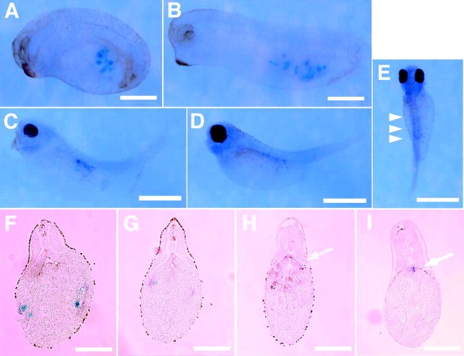 Figure 4. Whole-mount in situ hybridization for Xenopus tropicalis DAZ-like gene (Xtdazl) mRNA (A-E) and transverse section of Xtdazl-stained embryo (F-I). A,F: Xtdazl mRNA-positive cells are found in the posterior and lateral regions of the endoderm at St. 23. B,G: Some cells expressing Xtdazl mRNA gradually migrated to more anterior and dorsal endodermal regions at St. 28. C,H: Xtdazl mRNA-positive cells indicated by the arrow in H are localized beneath the dorsal mesentery at St. 35. D,I: Xtdazl mRNA-positive cells indicated by the arrow in I are confined to the dorsal crest at St. 40. E: The cells indicated by the arrowheads are not spread laterally. Scale bars = 500 mu m in A-E, 200 mu m in F-I.