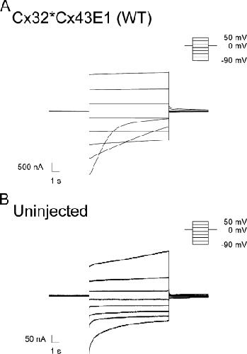 Figure 1. (A) Macroscopic current traces obtained from WT Cx32*Cx43E1 unapposed hemichannels after polarizations in 20-mV increments between −90 and 50 mV from a holding potential of 0 mV. The small increase in current level at large positive voltages results from the activation of an endogenous oocyte channel as assessed by recording uninjected oocytes. (B) Macroscopic current traces obtained from an uninjected oocyte illustrating typical endogenous currents present in oocytes obtained from Xenopus 1 frogs in Cs-MES bath solutions. There is variability in the form and magnitude of endogenous currents among oocytes, but in most cases endogenous currents contribute <300 nA. |