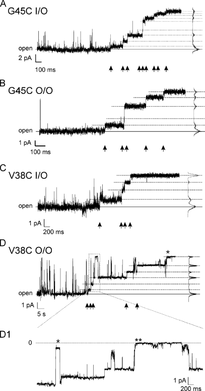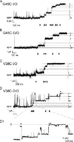Figure 2. G45C and V38C residues are modified by MTSEA–biotin-X. Segments of patch clamp records of G45C and V38C after the addition of MTSEA–biotin-X to the bath solution at a final concentration of 1 or 0.5 mM. Arrows at the bottom of each panel mark step changes in conductance that are consistent with the reaction of a cysteine residue with MTSEA–biotin-X. Changes in current levels were determined with the all-point histograms shown on the right side of each panel. (A) Inside-out recording of two G45C channels. Nine conductance changes are evident, consistent with modification of 9 of 12 available G45C residues. The first modification event occurred 20 s after the bath application of 1 mM MTSEA–biotin-X. (B) Outside-out recording of a single G45C channel illustrating five conductance changes, consistent with modification of five of six available cysteine residues. The first modification event occurred 6 s after the bath application of 1 mM MTSEA–biotin-X. (C) Inside-out recording of a single V38C channel illustrating four conductance changes consistent with modification of four of six available subunits. The first modification event occurred 18 s after the bath application of 1 mM MTSEA–biotin-X. (D) Outside-out recording of a single V38C channel illustrating six conductance changes. It is not clear if the final conductance change, marked by an asterisk, resulted from a reaction, gating event, or channel loss; thus, at least five of six cysteine residues are modified. The first modification event occurred 64 s after the bath application of 0.5 mM MTSEA–biotin-X. The longer time to the first modification event correlates with the lower concentration of MTSEA–biotin-X used in this record (0.5 mM vs. 1.0 mM) than was used in the previous records. (D1) This is an enlargement of the boxed region of D. The event marked by the single asterisk is a Vj-gating transition that occurred after modification of two cysteine residues. The event marked by two asterisks is a loop-gating transition that occurred after three cysteine subunits were modified by MTSEA–biotin-X. Note that the loop- or slow-gating event involves a series of small amplitude transitions giving the appearance of a complex gating event with a measurable time constant, whereas the Vj-gating event occurs as a single fast step between the open state and a subconductance state. Zero current level indicated by the dashed line is the leak-subtracted current. |