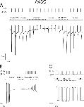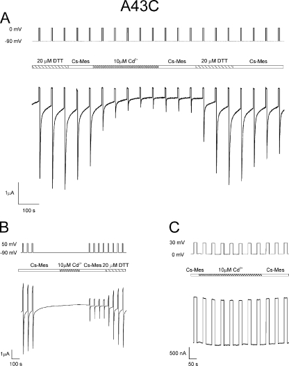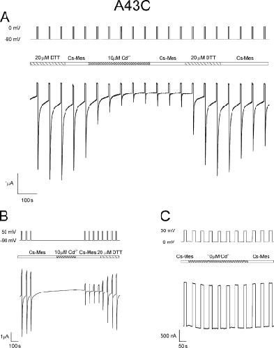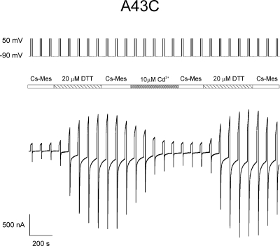 Figure 3. DTT and cadmium alter levels of A43C currents. Macroscopic currents elicited from an oocyte expressing A43C unapposed hemichannels with the voltage paradigm shown at the top of the panel. The central bar indicates the time and duration at which the bath solution containing 100 mM Cs-MES, 1.8 mM CaCl2, and 10 mM HEPES, pH 7.6, was exchanged with the same bath solution except containing either 20 µM DTT or 10 µM CdCl2. Currents increased to a steady-state level approximately fivefold greater than the initial currents after exposure to 20 µM DTT and decreased to ∼80% of maximum after treatment with 10 µM CdCl2. The reduction in current was not changed substantially by washing with the bath solution but was reversed to pre-cadmium levels after wash with 20 µM DTT. |