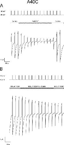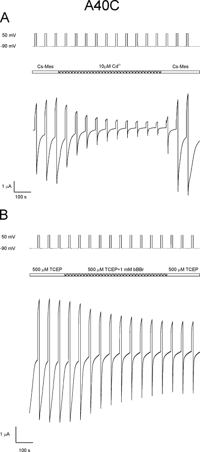 Figure 6. Modification of A43C residues by bBBr occurs at voltages that favor channel closure. (A) Macroscopic currents attributable to A43C channels are irreversibly decreased when exposed to bBBr during a voltage paradigm, steps between 0 and −90 mV, which elicits gating transitions between the open (0 mV) and either loop- and/or Vj-gating closed states (−90 mV). (B) Application of bBBr during a voltage paradigm, steps from 0 to 30 mV, which favors population of the open-channel state, has no effect on A43C macroscopic currents. The central bar in both panels indicates the time and duration for which the bath solution containing 500 µM TCEP was exchanged with the same bath solution containing 1 mM bBBr and subsequently washed with TCEP containing bath solution. |