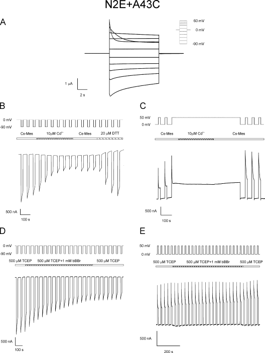 Figure 8. Unapposed N2E+A43C hemichannels are locked by cadmium and accessible to bBBr modification when the channel is closed by loop gating, but not Vj gating. (A) Macroscopic current traces obtained from N2E+A43C unapposed hemichannels after polarizations to voltages shown in the inset of 0 mV. Current relaxations at hyperpolarizing and depolarizing potentials result from the closure of loop and Vj gates, respectively. (B) Macroscopic currents were recorded from oocytes expressing the double mutation, N2E+A43C. The N2E mutation reverses the polarity of Vj gating from closure at hyperpolarizing potentials to closure at depolarizing potentials but does not change the polarity of loop gating. The application of 10 µM CdCl2 during a series of voltage steps between 0 and −90 mV causes a large decrease in membrane currents that can only be reversed by treatment with 20 µM DTT. Polarizations to −90 mV strongly favor the closure of loop gates, whereas residency in the open state is favored at a holding potential of 0 mV. (C) Macroscopic currents recorded from N2E+A43C oocyte using a similar protocol to that used in Fig. 5 B. 10 µM CdCl2 was applied to the channel after a long-duration depolarizing step to 50 mV that strongly favors closure of only the Vj gates. After wash with Cs-MES bath solution, the effect of cadmium on Vj gate closed channels was assessed by the application of a series of polarizing steps between 0 and 50 mV. This polarization elicits gating transitions between the open and Vj-gating closed states. Currents were similar to those obtained before cadmium application, demonstrating that A43C residues do not coordinate cadmium when the channel is closed by Vj gating. (D) Macroscopic current traces elicited by repeated polarizations between 0 and −90 mV, a voltage paradigm that elicits transitions between open and loop gate closed channels. At the position indicated, channels were exposed to 1 mM bBBr in the presence of 500 µM TCEP and subsequently washed with 500 µM TCEP. The observed reduction in current is consistent with a reaction between the A43C residue and bBBr. (E) Macroscopic current traces elicited by repeated polarizations between 0 and 50 mV, a voltage paradigm that results in the opening and closing of Vj gates. At the position indicated, channels were exposed to 1 mM bBBr in the presence of 500 µM TCEP and subsequently washed with 500 µM TCEP. The absence of any reduction in current is interpreted to indicate the inaccessibility of A43C residues to bBBr modification when the N2E+A43C channel resides in the open state and the Vj-gated closed state. |
