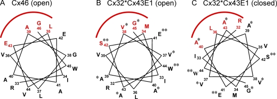 Figure 10. Helical wheel representation of reactive residues at the TM1/E1 border of Cx46 and Cx32*Cx43E1. (A) Helical wheel representation of residues R33 through G46 of Cx46. The residues span the TM1/E1 border, with residue E42 believed to be located on the membrane border. Residues accessible to MTS reagents applied to both the intercellular and extracellular face of the unapposed hemichannel are shown in red. These residues reside on one side of the helix, subtend an arc of ∼80°, and line the pore of the open Cx46 unapposed hemichannel. Residue R33 is topmost in the figure, with the residue number increasing counterclockwise. Data are taken from Kronengold et al. (2003). (B) Helical wheel representation of homologous residues R32 through G45 of Cx32*Cx43E1 that line the pore of the open unapposed Cx32*Cx43E1 channel. Residues examined in this study are marked with asterisks. Two residues, V38C and G45C, react with MTSEA–biotin-X when the reagent is applied from either the intracellular or extracellular face of the channel and consequently are assigned as pore lining. Expression levels of S42C and E41C were insufficient to allow studies of accessibility to thiol modifying reagents, whereas W44C did not express membrane current. These residues are marked by two asterisks. (C) Helical wheel representation of the loop gate closed Cx32*Cx43E1 channel. The helical wheel pictured in B was rotated 140° clockwise to position residues A40C and A43C. This position accounts for the observed sensitivity of residues A40C and A43C to Cd2+ and their modification by bBBr when the channel is closed by loop gating (see Discussion). |