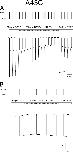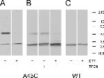 Figure 4. Western blots of WT (Cx32*Cx43E1) and mutant (A43C) membrane-inserted hemichannels. + and − symbols at the bottom of each panel denote treatment of the sample with or without either 50 mM DTT or 10 mM TPEN before SDS-electrophoresis through 5–40% gradient polyacrylamide gels. The position of pre-stained molecular weight standards (Thermo Fisher Scientific) are presented as bars on the right side of the figure. The band with molecular weight ∼50 kD corresponds to a connexin dimer, whereas the monomer has an electrophoretic mobility comparable to a molecular weight standard of ∼27 kD. Only treatment with DTT reduces the dimer to the monomeric connexin form. |