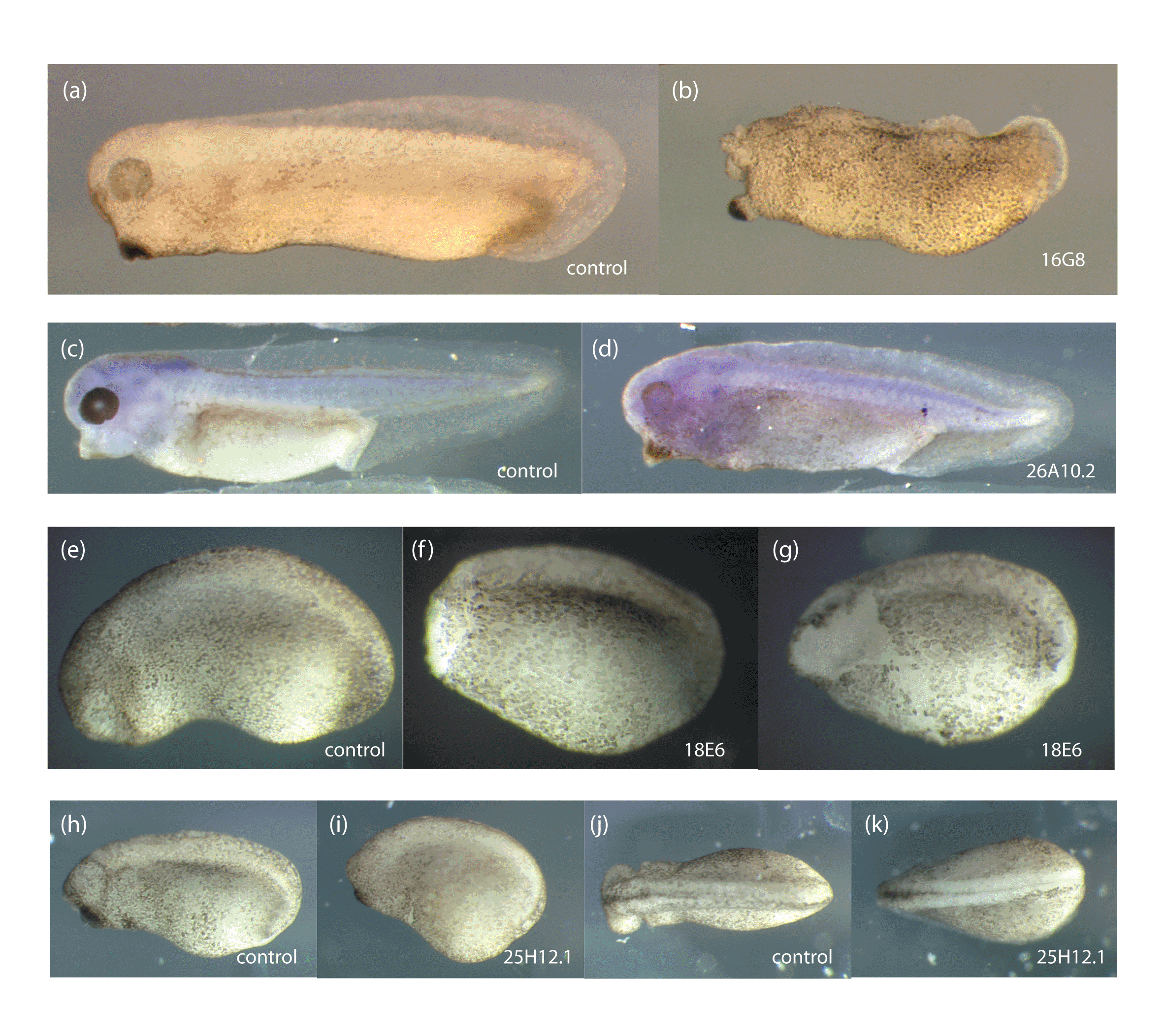 Figure 2. A: Reproducible phenotypes induced by morpholino (MO) injection. Control uninjected embryos and embryos injected with each MO, as indicated. All are hybridised with a neural marker (blue staining), apart from (pâs) which are unstained, as follows: aâd, ElrC; e,f, Sox3; gâo, N-tubulin. The main features of the phenotypes caused by the MOs were as follows: 16G8 causes shortening of the anteriorâposterior axis, 26A10.2 causes a reduction of ElrC staining particularly in the cranial nerve region (arrowhead in d) and broadening of the hindbrain (arrowhead in f), 17D4 causes posterior truncation (h) and/or bifurcated axis (i), 26E1.1 results in enhanced posterior development/open proctodeum (arrowhead in k and l) and hypodorsalisation, 18E6 causes cell death that starts anteriorly (n) and spreads posteriorly (o), and 25H12.1 causes extreme microcephaly. Most are lateral views apart from e,f,m,n,o,r,s, which are dorsal views. Anterior is to the left in all panels. Each set of control and experimental embryos was photographed under the same magnification (Ã40âÃ60). B: Expression patterns of targeted genes by in situ hybridisation. a: Expression of 16G8 (blue) along the neural tube of a neurulaembryo. b: Expression of 16G8 (magenta) in a broad band around the equator of a gastrulating embryo, blastopore side down. c: 26A10.2 expression is high in neural tissue of neurula embryos. d: 17D4 expression in a neurulaembryo. e: 26E1.1 expressed at the anterior neural tube. f: 18E6 expression at the anterior end of the neural tube. g: 25H12.1 expression in mid-anterior neural plate in two bilateral patches (black arrowhead) and the anterior neural ridge (white arrowhead). h,i: 25H12.1 is expressed around the blastopore of gastrulating embryos but excludes the dorsal mesoderm highlighted by in situ hybridisation to chordin (in light blue). All neurula embryos are viewed from the dorsal side with anterior to the front.
