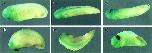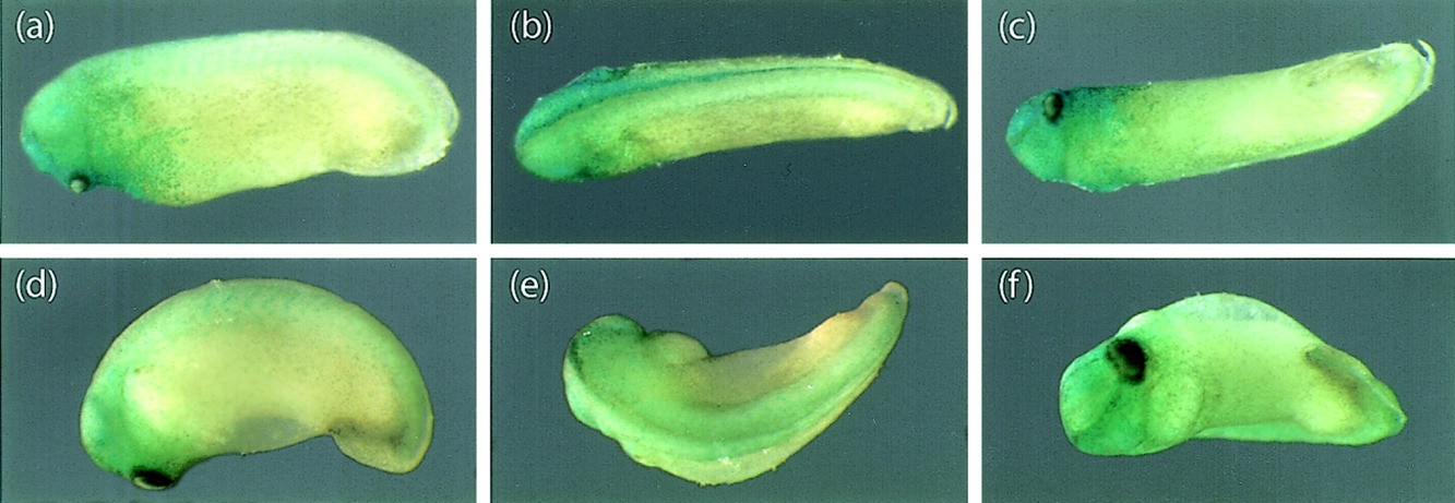 Figure 6. Overexpression of 25H12.1 (pinhead) causes enlarged heads. Xenopus laevis embryos were injected in each blastomere after the first cleavage with 1 ng of 25H12.1 sense mRNA containing the coding section of the gene together with 100 ng/blastomere of nuclear beta -gal mRNA as an injection tracer (blue stain). Pinhead-injected embryos show enhanced anterior development (d-f) compared with embryos injected with nuclear beta -gal alone (a-c), as well as some epidermal blistering in the trunk.