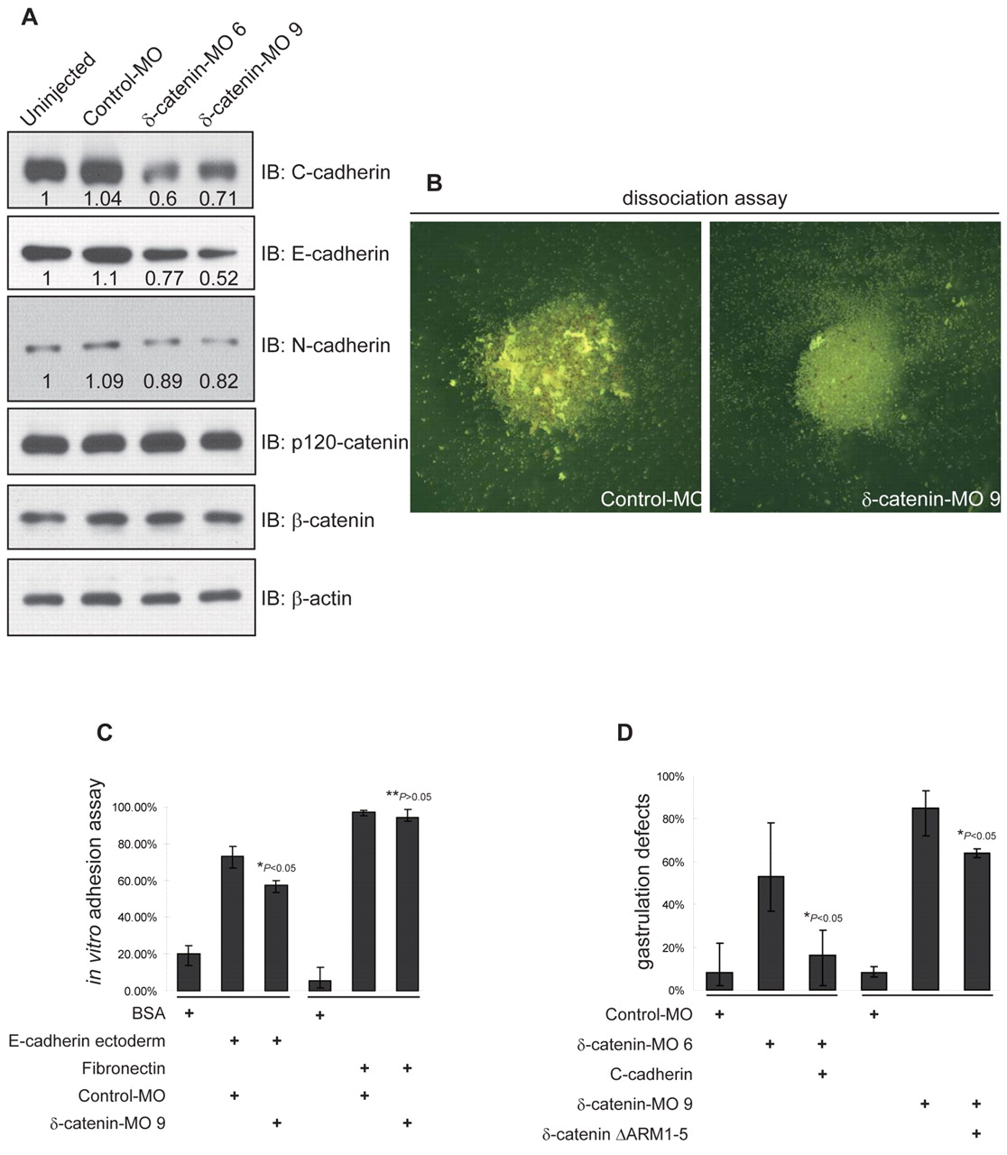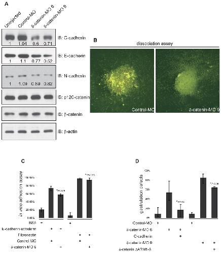 Figure 7. δ-catenin depletion leads to reduced cadherin functions. (A) Immunoblotting shows that δ-catenin depletion reproducibly leads to reduced C-, E- and N-cadherin levels, whereas p120-catenin and β-catenin levels are not significantly altered.(B) Calcium-dependant adhesive functions were decreased in δ-catenin-depleted naive ectoderm cells. Following calcium removal from ectoderm explants, note the larger cell aggregates remaining after control MO injection. (C) Using an in vitro assay with the extracellular domain of E-cadherin tethered to a solid substrate (chamber glass), cadherin-mediated adhesion is decreased in naive ectoderm cells depleted of δ-catenin. By contrast, a similar assay that uses tethered fibronectin, did not resolve changes in cell attachment (presumably integrin mediated). (D) A titrated dose of exogenous C-cadherin significantly rescues blastopore closure defects induced by depletion of endogenous δ-catenin. By contrast, a δ-catenin mutant construct lacking armadillo repeats 1-5, and failing to co-immunoprecipitate with C-cadherin (supplementary material Fig. 5A) showed minimal rescuing effects. For all panels P-values indicate statistical significance. |