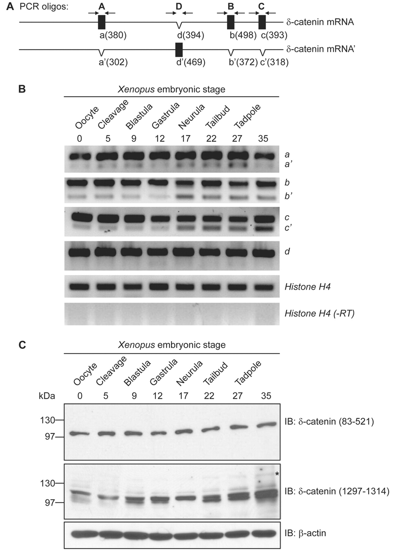 Figure 2. enopus δ-catenin temporal expression profiles. (A) Schematic diagram of δ-catenin alternative splicing events, and the PCR primers used to resolve them. The nucleotide lengths of PCR products are indicated in parentheses. (B) RT-PCR analyses indicate δ-catenin transcripts are deposited maternally and expressed throughout early embryonic stages. Both long (a,b,c) and short (a′,b′,c′) splicing variants were detected, with b′ and c′ having increased expression following neurulation. (C) Immunoblotting confirms δ-catenin protein expression throughout Xenopus embryogenesis. Antibodies directed against Xenopus amino acids 83-521 (N-terminal domain) recognize a δ-catenin isoform migrating at approximately 100 kDa; antibodies directed against Xenopus amino acids 1297-1314 (C-terminal domain) react mainly with a 100 kDa doublet, with reactivity additionally appearing at 130 kDa (marked with an asterisk) and 160 kDa (not shown, but see Fig. 3C). The 130 and 160 kDa bands are most evident following immunoprecipitation (results not shown). |