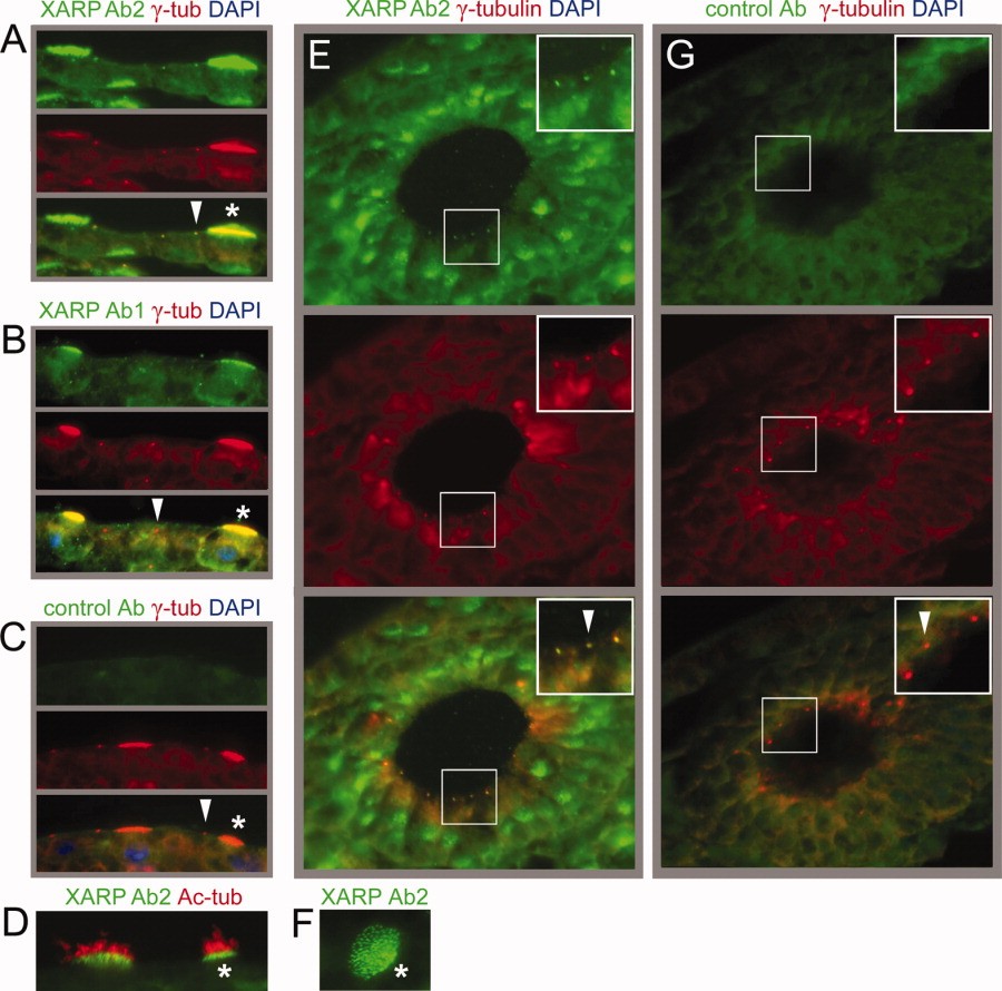 Figure 5. Localization of endogenous XARP in the centrosome and basal bodies. A,D,F: XARP Ab2 detects basal bodies of ciliated cells and apically localized centrosomes in the epidermis. B: XARP Ab1 detects basal bodies in the epidermis. C: Control rabbit antibody (anti-myc) does not detect either basal bodies or centrosomes in the epidermis. E,G: XARP Ab2, but not a control rabbit antibody (anti-GST), detects centrosomes in the retina. Insets show magnified images of the boxed areas. All images are cross-sections of stage 26 Xenopus embryos (except F, a surface view of a ciliated cell) co-stained with rabbit polyclonal XARP Ab1 or Ab2 (green), mouse gamma -tubulin antibody (red) or mouse acetylated tubulin antibody (cilia marker, red), and DAPI (chromatin marker, blue). A-C,E,G: Bottom panels are merged images of the top two panels. Arrowheads mark centrosomes, asterisks mark basal bodies.