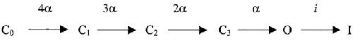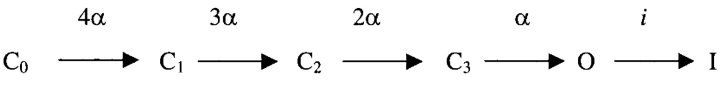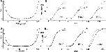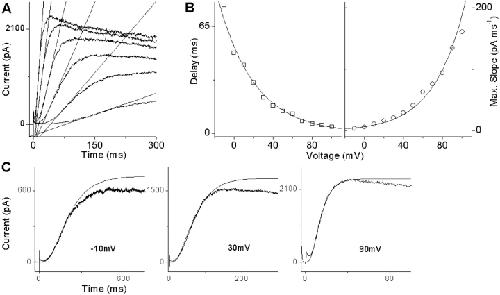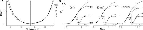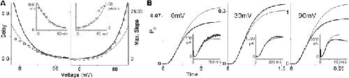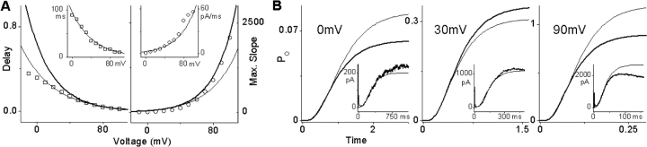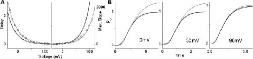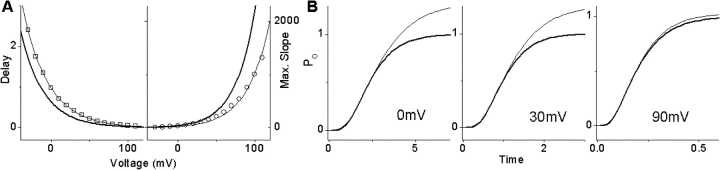 Figure 12. . Simulated kinetic data for four irreversible subunit activation steps and one final concerted transition with rate . α0= 1, zα = 0.85, γ0= 2, zγ = 0.42 (arbitrary units). (A) Symbols, simulated td(V) and SMax(V). Thick lines, predicted delay or maximum slope without (i.e., with infinitely fast) last step. Naturally, the additional step prolongs the delay and slows the current rise. Thin line (delay), fit of td(V) with Eq. 4, apparent α0= 0.65 and zα = 0.9. Thin line (slope), fit of SMax(V) with Eq. 3, zα forced to the value from the delay fit. SMax(V) is really somewhat biphasic, but can be described satisfyingly with zα = 0.9. (B) Simulated PO(t) (thick lines) and fits with Eq. 2, α0 and zα from the delay fit (thin lines). The fits look reasonable at all voltages. Upscaling of the fit expression is required, but if we encountered this effect in our experiments, we couldn't easily differentiate it from that of inactivation. |