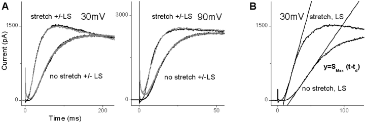 Figure 1. . (A) Effect of linear subtraction (LS). 5aa currents during depolarizations from −90 mV to 30 and 90 mV with (black) and without (gray) linear subtraction are compared as described in the text. The faster currents in each panel were recorded with stretch (using −45 mm Hg), the slower currents before and after stretch. Channel currents and capacitive transients are well separated. The traces demonstrate that nonleaky patches were used and that 5aa, with its slow activation, was an ideal mutant for the kinetic analysis undertaken here. Thus, although LS was used routinely (see materials and methods), it was not critical for obtaining accurate 5aa channel current amplitudes or maximum rates of rise. (B) Maximum slope line analysis. Maximum slope lines fitted to 30 mV leak-subtracted currents with/without stretch from A. The fit quantifies characteristic properties of current activation: SMax − maximum slope, and td − delay. |