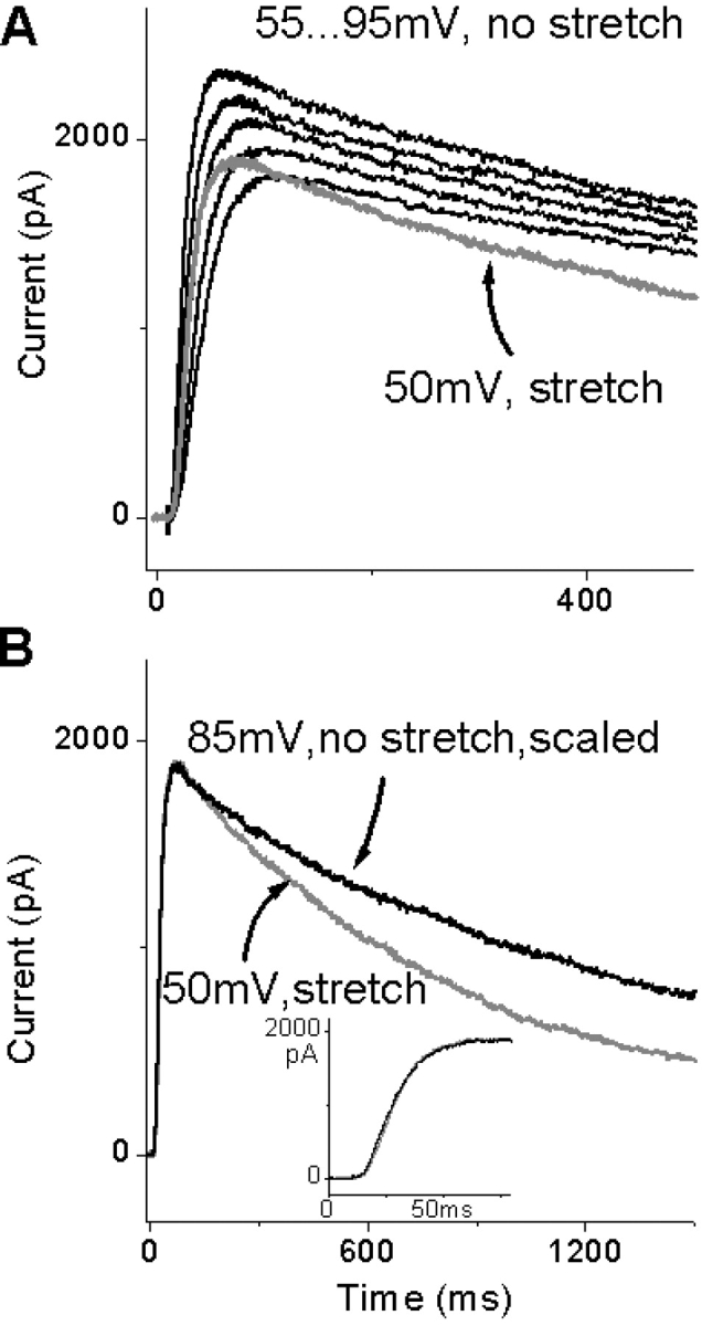 Figure 3. . Trying to find a ΔV substitute for stretch. (A) 5aa currents evoked by stepping from −90 to 50 mV with −45 mm Hg suction (gray trace) and from −90 to 55–95 mV in 10-mV increments without suction (black traces). (B) The rising phases of the currents at 50 mV with stretch (gray) and 85 mV without stretch (black) are scaleable (inset, scaled currents on an expanded time scale). Downscaling was necessary to compensate for the increased driving force, but activation kinetics were otherwise identical: in its effect on channel activation, the 35-mV voltage increment was equivalent to the particular membrane stretch produced by −45 mmHg. Note, however, that compared with the accelerating effect of the stretch stimulus (at 50 mV), acceleration of inactivation by the depolarizing stimulus was less pronounced. |