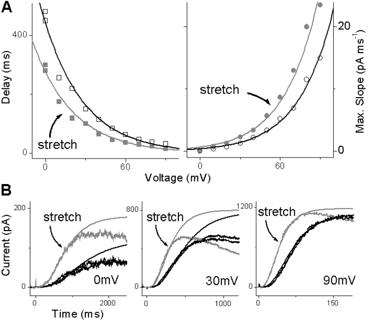 Figure 5. . The four-step model describes 5aa current properties with and without stretch. (A) Delay and maximum slope from 0 to 90 mV, with (gray symbols) and without −45 mm Hg suction (open symbols); voltage was stepped to the indicated levels from −90 mV. td(V) without stretch is fitted with Eq. 4, α0 = 1.4 s−1 and zα = 0.85. With stretch, the same zα, and α0 = 2.3 s−1 provide a good description. SMax(V) with and without stretch is well described by Eq. 3, multiplied by a linear driving force, and with the zα value from the delay fit. (B) Sample currents with (gray) and without stretch, before and after (black). PO(t) from Eq. 2 with zα and α0 from the td(V) fits in A has been scaled to match the current rise. |