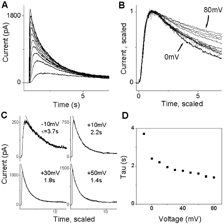 Figure 6. . 5aa slow inactivation. (A) In a typical experiment (15 μM Gd3+ in the pipette) currents were evoked by stepping from a holding potential of −90 mV in 10-mV increments from −10 to 80 mV, and recorded on a long time scale. (B) Currents from A. Amplitudes are normalized and the time scaled for each voltage so the rising phases overlap. Activation cannot be rate limiting for inactivation, because the scaled decline slows progressively with increasing voltage, with the sole exception of the response at −10 mV (the noisy, lighter colored trace). (C) The current falling phases can be fitted by Eq. 1. The time constant τ of the monophasic exponential decay to a constant plateau is given on each panel. (D) τ(V) declines with increasing voltage. |