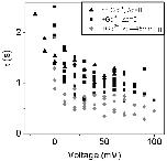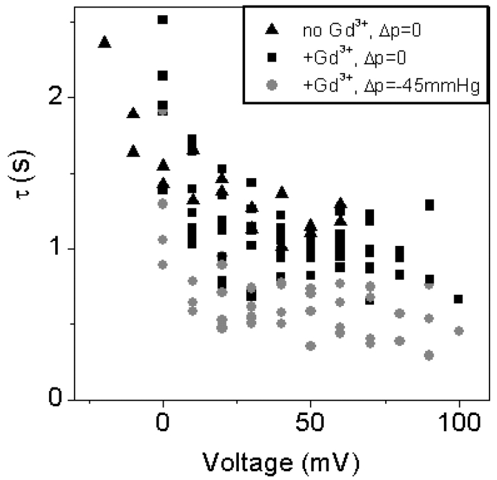 Figure 7. . Voltage dependence of the time constant τ from fits of Eq. 1 to current falling phases, with and without stretch, pooled from a number of experiments. Most data were obtained with 10–20 μM Gd3+ in the pipette, but some data without Gd3+ are also shown, as indicated. Stretch reduced τ at all voltages. Gd3+ had no discernible effect, but since it right shifts the g(V) relation (Gu et al. 2001), time constants could be obtained at −10 and −20 mV without Gd3+ but not with it. |