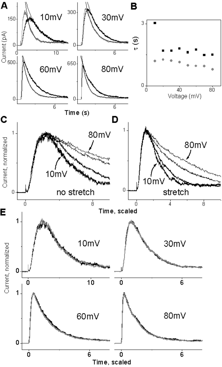Figure 8. . 5aa current decline and stretch. (A) Sample currents with and without −45 mm Hg suction. The falling phases have been fitted with Eq. 1. Stretch decreases τ. (B) τ (V) with (gray circles) and without stretch (black squares). (C and D) The sample currents with and without stretch from A have been normalized, their times scaled to match all rising phases. The scaled falling phase decelerates with increasing voltage. Above 10 mV, where the falling phase is not rate limited by activation, the inactivation rate dominates falling phase dynamics. (E) Normalized currents with and without stretch. For each voltage, the time scale of the current with stretch has been expanded to match the rising phase of the current without stretch. Note that the entire scaled time courses are virtually identical. C and D showed that activation is not rate limiting for the current decline at these voltages and thus stretch, in contrast to voltage, seems to affect activation and inactivation in exactly the same way. |
