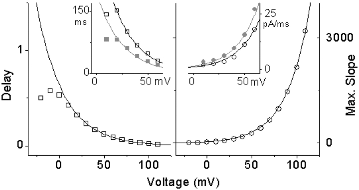 Figure 10. . Effect of back reactions with zβ < zα on td(V) and SMax(V). Simulated data. α0= 1, β0= 0.2, zα = 0.85, zβ = 1.7 (arbitrary units). From Eqs. A3 and A4, ≈−9 mV and V1/2 ≈ 0 mV. Symbols, simulated td(V) and SMax(V). Solid lines, predicted delay or maximum slope without deactivation (Eqs. 3 and 4). Simulated SMax(V) is indistinguishable from its counterpart for the irreversible model; simulated td(V) is well described at large voltages, but bends characteristically below 0 mV. PO(t) rise, and amplitudes (except at the lowest voltages) are well fitted by Eq. 2 (not depicted). (Inset) One of two observations of a bend in td(V). Experimental td(V) and SMax(V) relations with (gray symbols) and without stretch (open symbols). Delay fits (from which the bend region has been excluded) by Eq. 4, apparent α0= 1.9 s−1 and α0= 3.3 s−1 without and with stretch, respectively, zα = 1 for both. Maximum slope fitted with Eq. 3 (multiplied by linear driving force) and the same zα. As in the simulated example, current rise and amplitudes were well fitted by Eq. 2 with the parameters from the delay fit, except at the lowest voltages, where amplitudes were smaller (not depicted). |