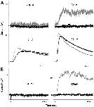 Figure 11. . Effect of back reactions with zβ < zα. α0= 1, β0= 1, zα = 0.85, zβ = 0.17 (arbitrary units). From Eqs. A3 and A4, ≈−40 mV and V1/2 ≈ 42 mV. (A) Symbols, simulated td(V) and SMax(V). Thick lines, predicted delay or maximum slope without deactivation. Deactivation shortens the delay and reduces the maximum slope for all but the highest voltages. Thin line (delay), fit of td(V) with the four-step model (Eq. 4), apparent α0= 1.7 and zα = 0.66. Thin line (slope), fit of Smax(V) with Eq. 3 and zα forced to the value from the delay fit. The resulting fit is not very good, Smax(V) is somewhat steeper. (Inset) Experimental example. td(V) and SMax(V) relations (delay fit, α0= 6.7 s−1, zα = 0.57; slope fit, zα forced to 0.57). (B) Fits of simulated PO(t) rise (thick lines) with Eq. 2 and the apparent parameters from the td(V) fit (thin lines). At 0 mV, the fit amplitude is larger, and at 30 mV it is smaller than the peak PO. At 90 mV, Eq. 2 needs to be strongly upscaled to fit the early rising phase of PO. (Inset) Experimental example, as in A. When fitting the recorded current rise with Eq. 2 and the parameters from the delay fit, the fit amplitudes at 0 and 30 mV are smaller, and at 90 mV larger than the peak current. |