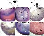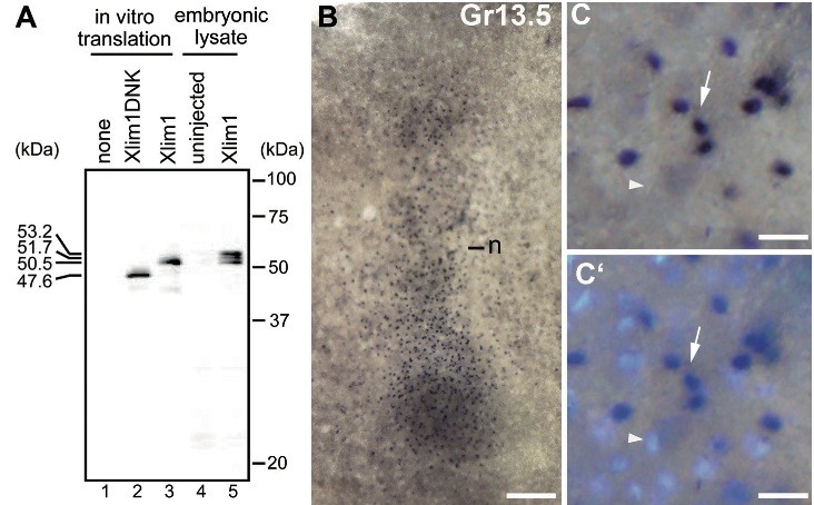 Immunoblot analysis. Lanes 1 through 3 are in vitro translated products, and lanes 4 and 5 are embryonic lysates. Lane 2, Xlim1DNK is the N-terminal LIM domain-deleted construct, Xlim1δNK (Karavanov et al., 1996). (B) Whole mount preparation of the G. riobambae noto- chord. The rostral region is oriented towards the top. (C) Higher magnification of the Lim1 signal observed in B. (C Nuclear staining of the image shown in (C). There is quenching of fluorescence in the Lim1-positive nuclei. Three Lim1-positive nuclei are indicated by arrows and a Lim1-negative nucleus by arrowheads in (C,C. In this and the following figures, letters and numbers in the upper right hand corner indicate species and developmental stage. Cm, C. machalilla; Er, E. randi; Gr, G. riobambae; and Xl, X. laevis. Abbreviations: n, notochord. Scale bars: 200 μm (B); 25 μm (C- C. |