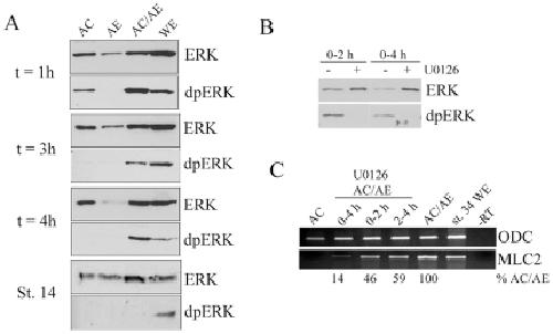 Figure 5. ERK is activated during the first 4 hrs and is required for cardiogenesis over the same period.(A) ERK is activated for at least 4 hours after conjugation of animal cap and anteriorendoderm. Animal cap, anteriorendoderm or AC/AE explants were collected at indicated times after conjugation and were subjected to Western analysis for doubly-phosphorylated ERK (dpERK) and total ERK. The latest time-point (St. 14) corresponds to 8â10 hours after conjugation. (B) U0126 treatment for the first 2 or 4 hours after conjugation effectively blocks ERK activation. (C) ERK activity is required during at least first four hours after conjugation for efficient cardiogenesis.