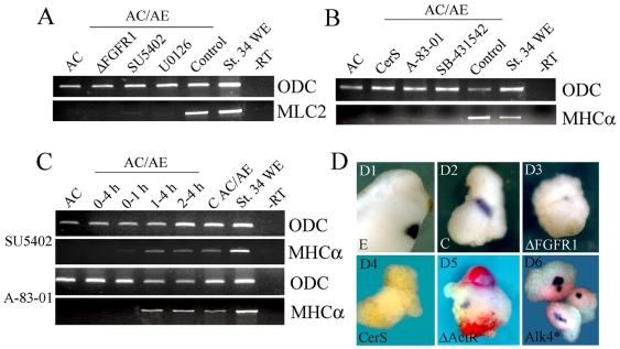 Figure 4. FGF and Nodal signaling are required during the first hour of cardiac induction.(A) AC/AE conjugates were made with animal cap expressing δFGFR1 or with uninjected animal cap that were continuously incubated with SU5402 (50 µM) or U0126 (35 µM) from the time of conjugation, or were treated with DMSO (Control). MLC2 expression was analyzed at st. 34. (B) CerS (injected in animal cap) or continuous incubation with SB-431542 (75 µM) or A-83-01 (75 µM) block induction of MHCα. (C) FGF and Nodal signaling are only required the first hour of contact between AC and AE. (D) In situ hybridisation analysis of cardiac TnI expression in AC/AE conjugates. D1,2- control embryo and AC/AE explant. 83% (nâ=â23) explants are cTnI+. D3- expression of δFGFR1 in animal caps leads to a greatly reduced expression of cTnI in 89% (nâ=â19) explants. D4- 0/15 of CerS explants express cTnI. D5- mosaic expression of δActRI (red) in animal caps prevents expression of cardiac TnI (0/11 cTnI+ explants in δActRI-injected cells), but not in neighboring tissue with intact Nodal signaling (5/11 cTnI+ explants; arrow in D5). D6- constitutively active Alk4* receptor induces cardiac expression cell-autonomously in animal caps (4/4 cTnI+, nâ=â12).