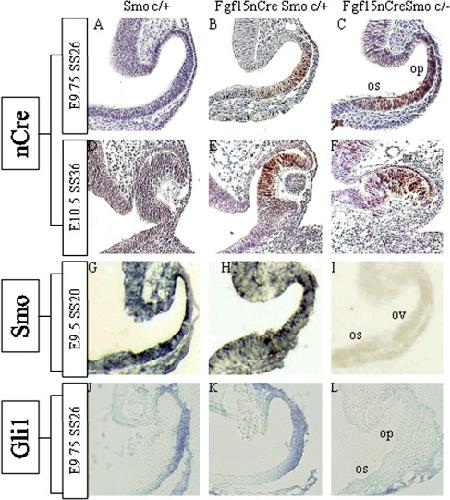 Fig. 1. Expression analysis of nCre protein and Smo mRNA. Coronal sections of eyes were immunostained with anti-Cre antibody at the 26-somite stage (AâC) and the 36-somite stage (DâF). Control 2 (B) and Smo-CKOs (C) showed nCre immunoreactivity (brown) in the distal to ventral walls of the optic cup. nCre expression (brown) was observed in the neural retina in Control 2 (E) and Smo-CKOs (F). In situ hybridization of Smo mRNA (GâI) at the 20-somite stage (E9.5): Smo mRNA expression was completely abolished in the optic vesicle and optic stalk of Smo-CKOs (I). In situ hybridization of Gli1 mRNA (JâL) at the 26-somite stage (E9.75): Gli1 mRNA expression was completely abolished on optic cup of Smo-CKOs (L). ov: optic vesicle, op: optic cup, os: optic stalk.
