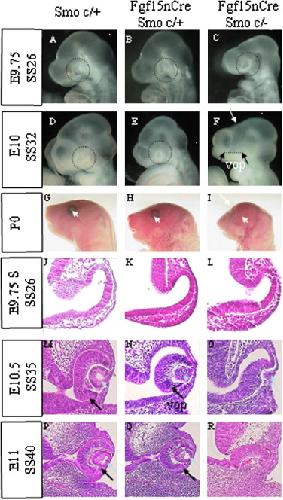 Fig. 2. Craniofacial morphology and eye histology. Craniofacial morphology: AâI. (AâC) The optic vesicle was not obviously different at the 26-somite stage (E9.75). (DâF) At the 32-somite stage (E10), Smo-CKOs showed the ventral defect of the optic cup (F, black arrow: vop) and the diencephalon was hypotrophic (F, white arrow). (GâI) P0: No eyes were observed in Smo-CKOs (I, white arrowhead) and the forebrain part was small (I, white arrow), while Contol 1 (G) and Control 2 (H) did not show any abnormality. Eye histology: JâR. (JâL) At the 26-somite stage (E9.75), the optic cup of Smo-CKOs was not obviously different from that of Controls. (MâO) At the 35-somite stage (E10.5), Smo-CKOs displayed the ventral half defect of the optic cup and the hypotrophic lens was detected (O, green arrow). (PâR) At the 40-somite stage (E11), the ventral half of the optic cup and the lens were missing in Smo-CKOs (R). Control 1 (P) and Control 2 (Q) did not show any abnormality. vop: ventral optic cup.