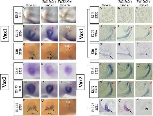 Fig. 5. Vax1 and Vax2 expression patterns in the optic vesicle and cup. (AâR) Side views of whole mount in situ hybridization. (Aâ²âRâ²) In situ hybridization on coronal sections. (AâC, Aâ²âCâ²) At the 20-somite stage (E9.5), the Vax1 mRNA expression pattern in Smo-CKOs was not obviously different from that in Controls. (DâF, Dâ²âFâ²) At the 24-somite stage (E9.75), comparing with Control 1 (D and Dâ²) and Control 2 (E and Eâ²), Vax1 mRNA was not expressed on the dorsal optic cup of Smo-CKOs (F, Fâ², red arrow). (GâI, Gâ²âIâ²) At the 30-somite stage (E10), in Smo-CKOs (I and Iâ²), Vax1 mRNA was downregulated in the ventral optic cup (black arrow) while Control 1 (G and Gâ²) and Control 2 (H and Hâ²) showed Vax1 expression in the ventral optic cup (black arrow). (JâR, Jâ²âRâ²) Vax2 expression patterns were examined. (JâL, Jâ²âLâ²). At the 22-sfomite stage (9.5), Vax2 expression patterns in the optic cup were not obviously different in all genotypes. (MâO, Mâ²âOâ²) At the 24-somite stage (E9.75), comparing with Control 1 (M and Mâ²) and Control 2 (N and Nâ²), Vax2 mRNA was not expressed in the dorsal optic cup of Smo-CKOs (O, Oâ², red arrow). (PâR, Pâ²âRâ²) At the 38-somite stage (E10), Vax2-positive ventral optic cup disappeared completely in Smo-CKOs (Râ², asterisk) while Control 1 (P and Pâ²) and Control 2 (Q and Qâ²) showed Vax2 expression in the ventral optic cup (black arrow). dop: dorsal optic vesicle/cup. vop: ventral optic vesicle/cup.