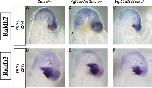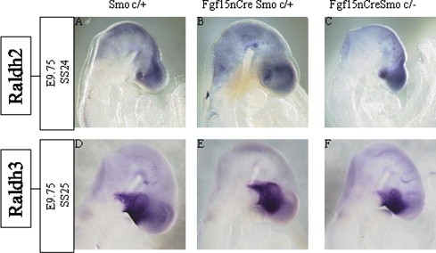 Fig. 7. Raldh2/Raldh3 expression patterns are not altered in the mutants. (AâC) At the 24-somite stage (E9.75), Raldh2 expression pattern in Smo-CKOs (C) was not obviously different from that in Controls (A and B). (DâF) At the 25-somite stage (E9.75), Raldh3 expression pattern in Smo-CKOs (F) was not obviously different from that in Controls (D and E).