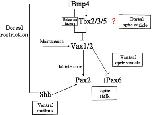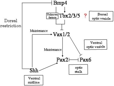 Fig. 8. Schematic representation of the relationship among Shh, Vax1/2, Pax2/6 and Bmp4. Shh signaling directly or indirectly mediates Vax1/2 expression in the eye field. Vax1 and Vax2 are suppressed by Bmp4 in the dorsal optic vesicle. This suppression might be mediated by Tbx and unknown factors. Vax1 and Vax2 directly inhibit Pax6 expression and maintain Pax2 expression. Pax2 and Pax6 transcriptionally repress each other.
