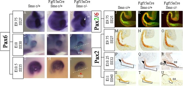Fig. 4. Pax6 and Pax2 expression patterns in the optic vesicle/cup and stalk. (AâI) Pax6 mRNA expression. (AâC) At the 27-somite stage (E9.75), all embryos showed normal expression patterns of Pax6. (DâF) At the 30-somite stage (E10.25), Smo-CKOs showed disturbed expression of Pax6 in the ventral optic cup (F, vop, red arrowhead). (GâI) At the 35-somite stage (E10.5), In Smo-CKOs (I) the Pax6 mRNA was confined to the dorsal optic cup only while Pax6 mRNA was expressed in both the ventral optic cup and the dorsal optic cup of Control 1 (G) and Control 2 (H). Coronal sections of eye: JâR. (JâL) SS25 (E9.75): The double immunostaining of Pax2 (green) and Pax6 (red). Pax2 and Pax6 were coexpressed in the optic vesicles (yellow). (MâO) At the 27-somite stage (E9.75), Pax2 expression was not obviously different among all genotypes. (PâR) At the 32-somite stage (E10.25), Pax2 expression domain in the mutant optic stalk (R) was similar to those seen in Control 1 (P) and Control 2 (Q). Pax2 expression of the dorsal optic cup was not detected in the mutants (R, black arrowhead). (SâU) At the 40-somite stage (E11), Pax2 expression was reduced in Smo-CKOs (U), compared to Control 1 (S) and Control 2 (T) not only in the optic cup but also in the optic stalk. os: optic stalk. dop: dorsal optic cup. vop: ventral optic cup.