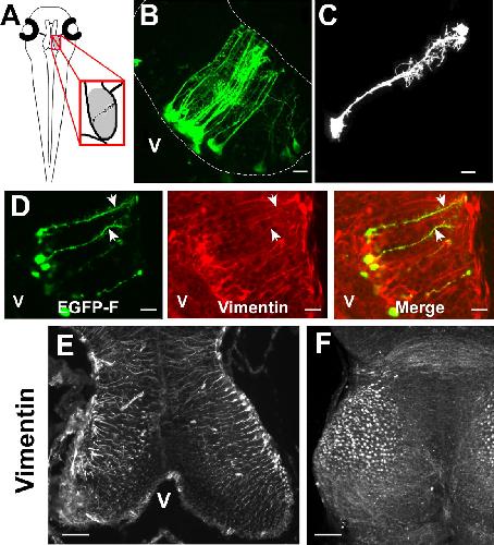 Radial glia characterization and distribution in the Xenopus optic tectum. A, Schematic indicating orientation of radial glia in the optic tectum of a tadpole. B, Radial glia in an optic tectum bulk electroporated with EGFP-F in a stage 48 tadpole. C, Morphology of a single radial glial cell expressing EGFP-F. D, Horizontal section through the optic tectum of a stage 48 tadpole in which glia are expressing EGFP-F (right panel), immunostained for Vimentin (center panel) and the merge showing colocalization of EGFP-F and Vimentin (left panel). Arrowheads point out two examples of double-labeled glia. E, Vimentin staining on a horizontal section of stage 48 tadpole brain labels the major radial branches that extend across the tectum. F, Vimentin-stained whole mount reveals a regular array of glial endfeet tiling the tectal neuropil where RGC axons innervate the tectum. Scale bars: B, D, 15 μm; C, 7 μm; E, F, 30 μm. V, ventricle. |