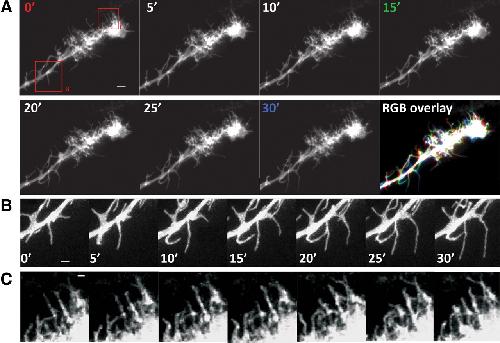 Radial glial processes exhibit rapid structural motility. A, Time series of a glia expressing EGFP-F imaged in vivo at 5 min intervals. The RGB merge of the time points with the red, green and blue boxes demonstrates the degree of structural remodeling seen. B, C, Higher magnification of the two boxed regions in A. Scale bars: A, 10 μm; B, C, 2 μm. |
