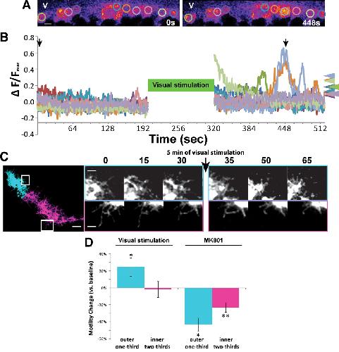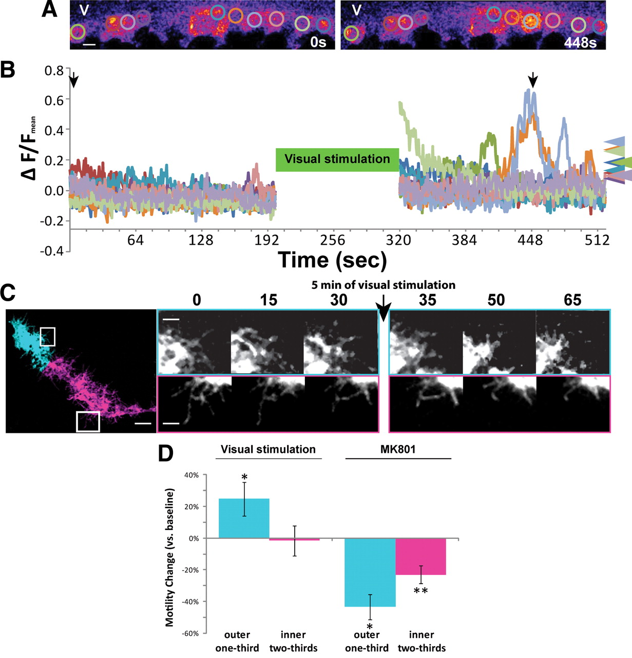 Visual stimulation regulates calcium transients and filopodial motility of radial glia. A, Two-photon optical section at two time points through glial cell body layer loaded by ventricular injection of OGB-AM. B, ÎF/Fmean of calcium signal for 10 glia indicated by the colored circles in A, before and after the contralateral eye was stimulated for 2 min. C, Time series of glia expressing EGFP-F collected at 15 min intervals, before and after 5 min of visual stimulation. Blue area corresponds to the retinorecipient outer one-third and the pink area to the inner two-thirds of the neuropil (the boxes represent the part of the cell shown at higher magnification in the right panel). D, Visual stimulation induced a net increase in glial motility selectively in the retinorecipient outer one-third of the neuropil. In contrast, the entire cell is sensitive to general NMDAR blockade by MK801 treatment. Scale bars: A, 15 μm; C left panel, 30 μm; C right panel, 7 μm. *p < 0.05; **p < 0.01, two-tailed paired t test comparing motility before and after visual stimulation or drug treatment. Error bars are SEM. |