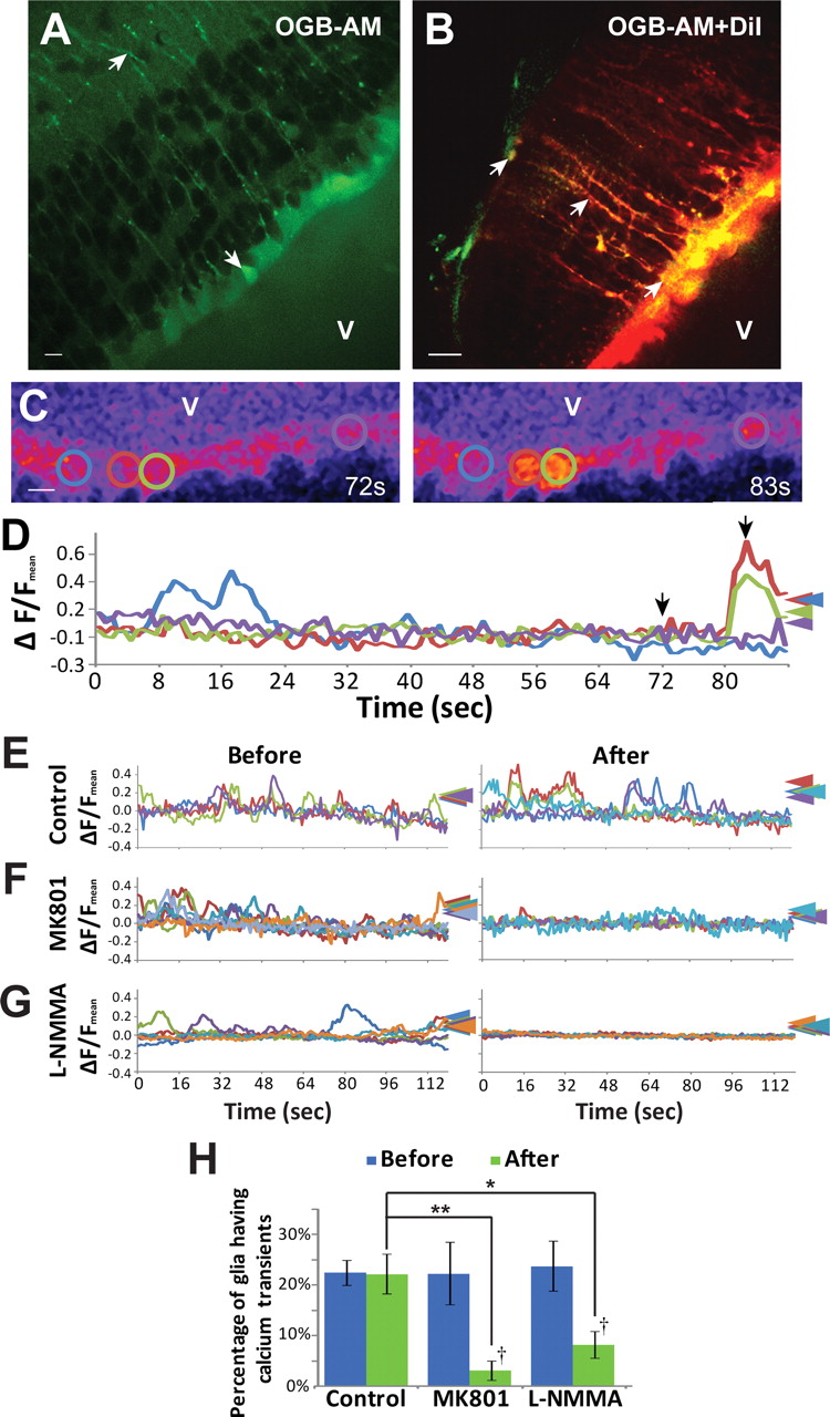 Modulation of tectal calcium transients by NMDAR activation and NO signaling. A, Single two-photon optical section through the optic tectum showing radial glia somata labeled by ventricular injection of OGB-AM. B, Morphology of radial glia visualized by ventricular injection of OGB-AM + 250 μM DiI. C, Pseudocolored OGB calcium signal in tectal glia somata. D, ÎF/Fmean of the fluorescence in 4 different glia indicated by the colored circles in C. EâG, ÎF/Fmean from all responding glial cells from two-photon optical sections in different animals before and after bath application of control buffer, 10 μM MK801 or 400 μM L-NMMA. Arrowheads on right indicate 2 SD above the mean. H, Percentage of glia per optical section exhibiting calcium transients before and after bath application of control buffer (N = 6), MK801 (N = 5), or L-NMMA (N = 7). v, Ventricle. *p < 0.05; **p < 0.01, ANOVA; â p < 0.05, two-tailed paired t test. Scale bars: A, C, 7 μm; B, 25 μm. Error bars are SEM. |