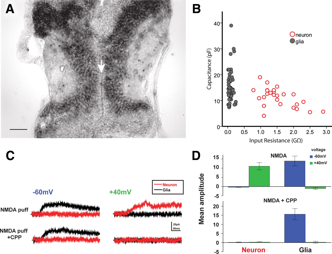 NMDARs are not expressed in radial glia. A, In situ hybridization against NR1 mRNA in stage 48 tadpole brain section shows no staining of radial glial cell bodies that line the ventricle (arrow). B, Morphologically identified radial glia cells were readily distinguishable from neurons based on overall larger capacitances and consistently lower input resistances in whole-cell recordings. C, Representative current traces of a neuron (red) and a glia (black) in response to a 100 ms puff of 100 μM NMDA onto the cell clamped at â60 mV (left) and +40 mV (right) in absence (top) or in presence (bottom) of the NMDAR antagonist CPP (100 μM). D, Mean response amplitudes generated in neurons (left) and glia (right) after an NMDA puff in the absence (top) or in presence (bottom) of CPP at different holding potentials. Because CPP blocks the classic NMDAR current in neurons, but not the outward current seen in hyperpolarized glia, this glial current is probably not mediated by NMDARs. Scale bar, 50 μm. Error bars are SEM. |