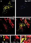 Radial glial processes contact retinotectal synaptic sites. A, z-Projections of RGC axon labeled with YFP (top left), coexpressing Syp-GFP to reveal presynaptic sites (top right), radial glia expressing mCherry in the same animal (bottom left), and YFP axon with radial glia expressing mCherry (bottom right). B, Higher-magnification single optical section from A (white square) to demonstrate contact between the RGC axon and glial process (left) at a Syp-GFP punctum (right). C, Three-dimensional reconstruction of the YFP+mCherry image in B. Scale bars: A, 10 μm; B, 5 μm; C, 3 μm. |